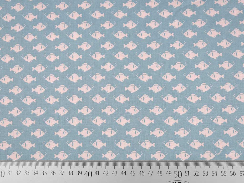 Ein toller Baumwollstoff mit seidig glatter Oberfläche in hellblau und weißen Fischen.