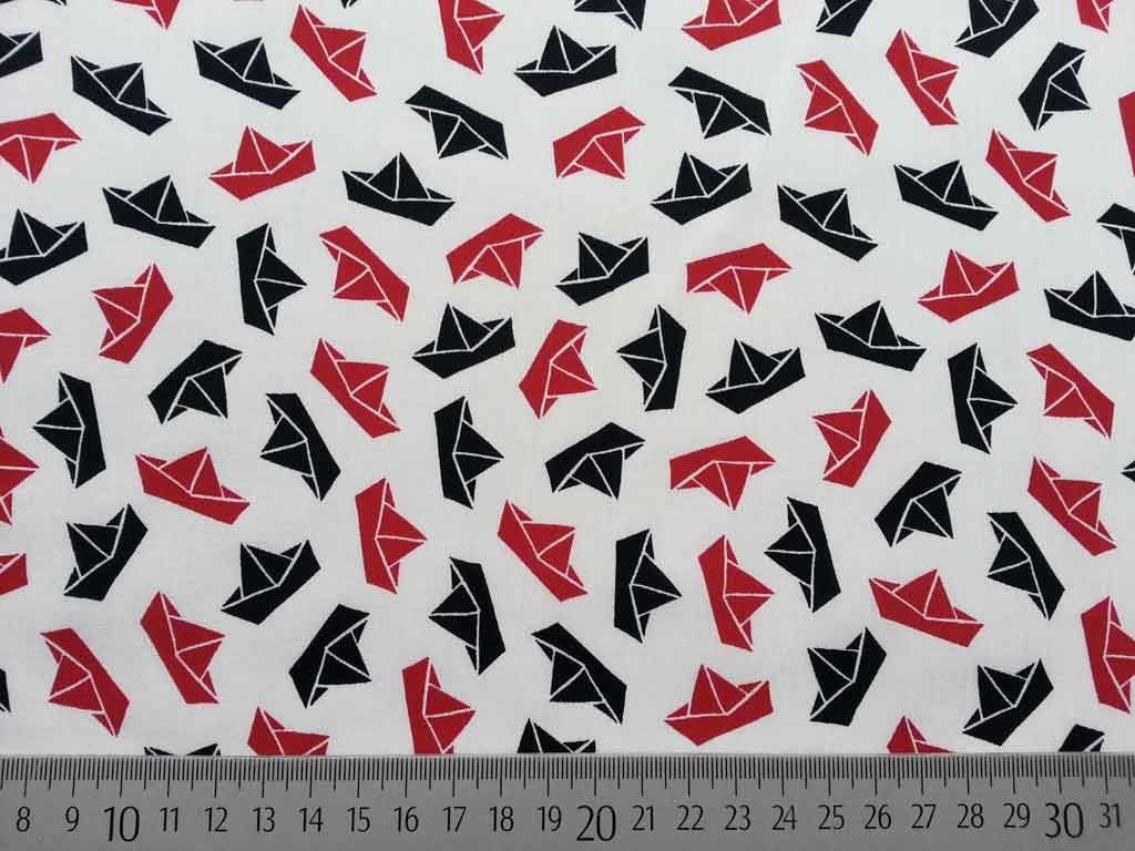 Ein weißer Baumwollstoff im maritimen Stil mit dunkelblauen und roten Papierschiffchen/Segelbooten.