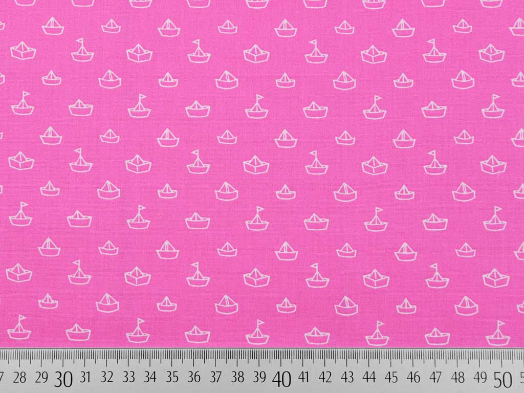 Ein hellpinker Baumwollstoff mit kleinen weißen Papierschiffchen.