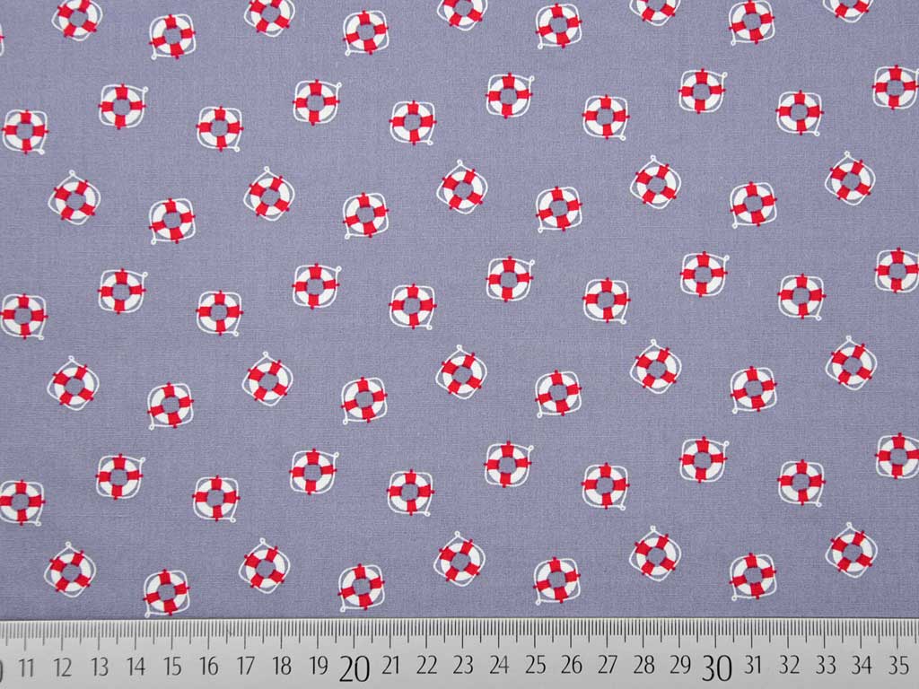 Ein grauer Baumwollstoff mit kleinen rot-weiß gestreiften Rettungsringen.