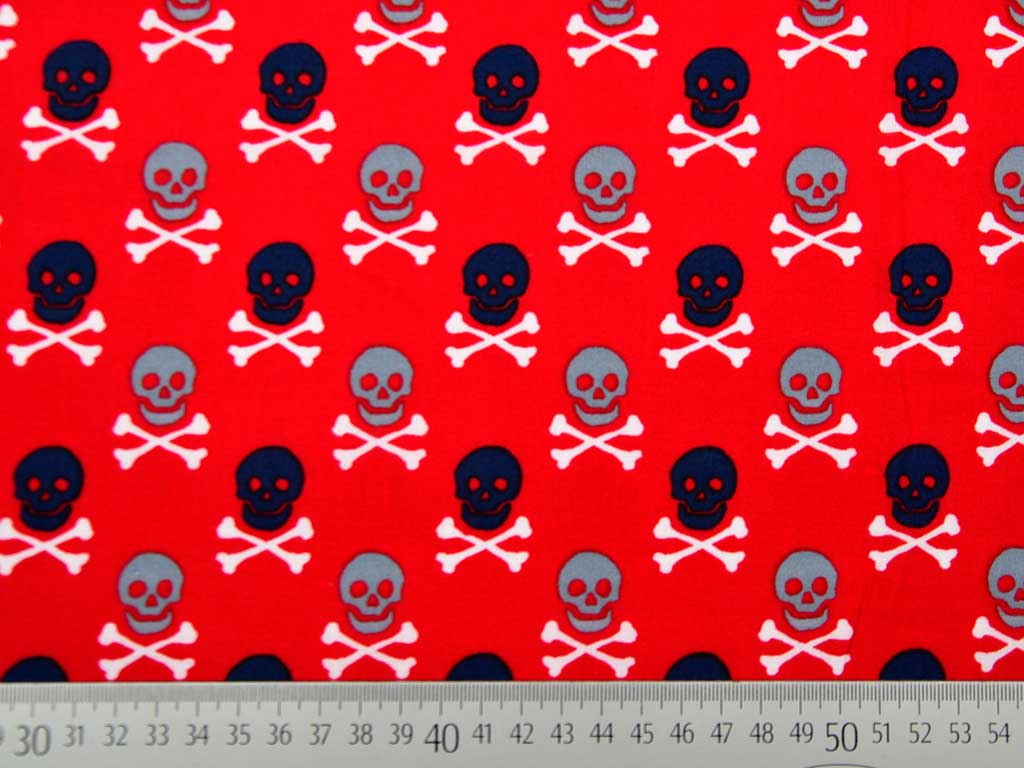 Ein wunderschöner maritimer Baumwollstoff mit seidig glatter Oberfläche in rot und dunkelblauen und grauen Totenköpfen sowie weißen Knochen.