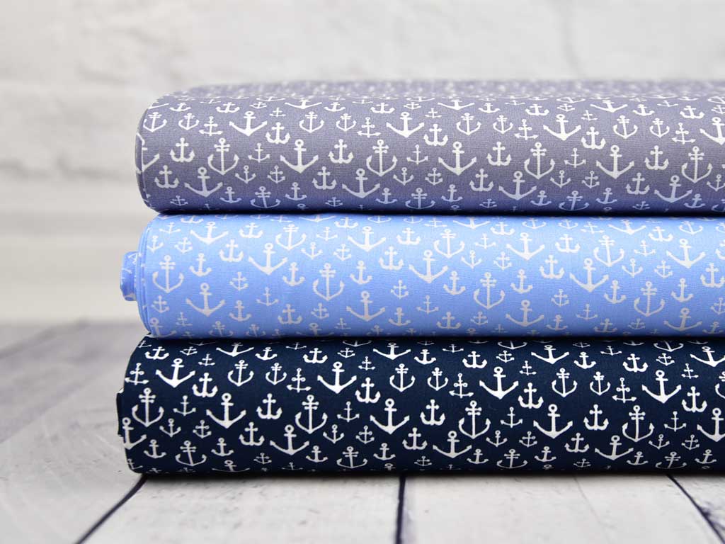 Ein hellblauer Baumwollstoff mit kleinen weißen Ankern.