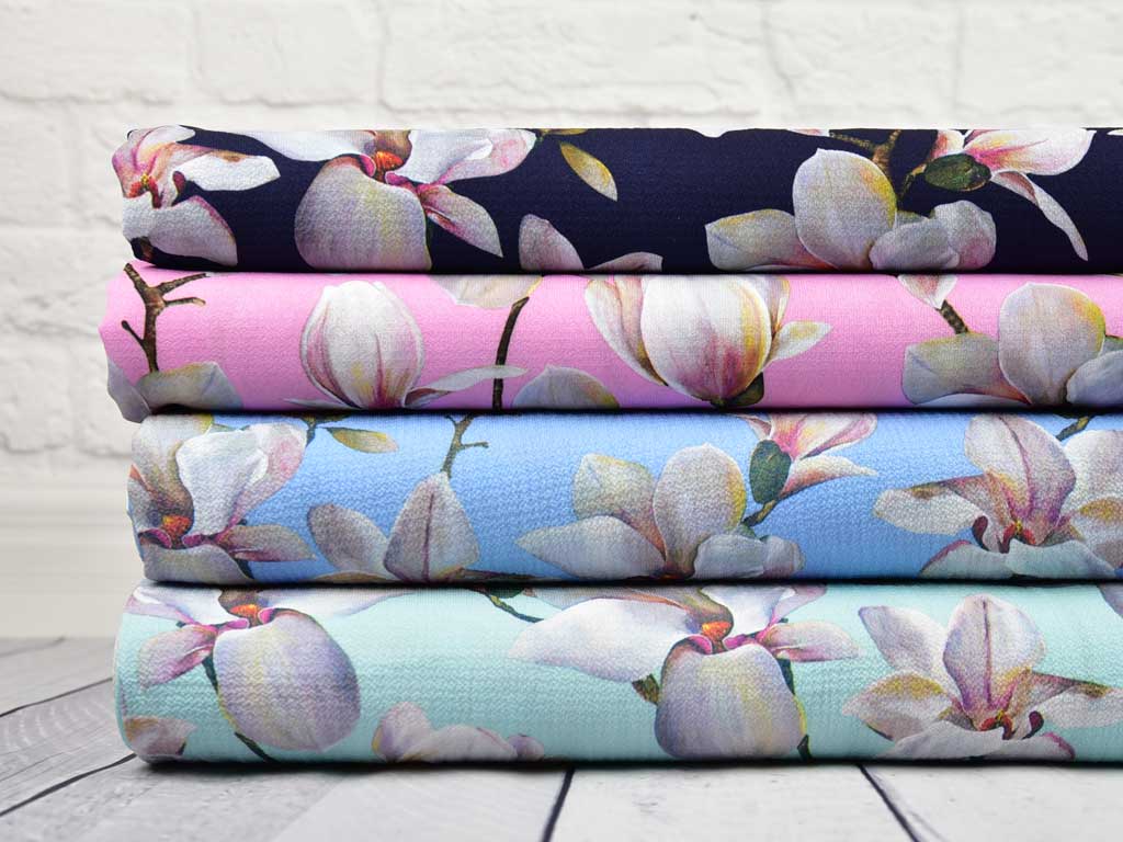 Ein weich fallender Blusenstoff in hellblau mit großen weiss rosa farbenen Magnolien.