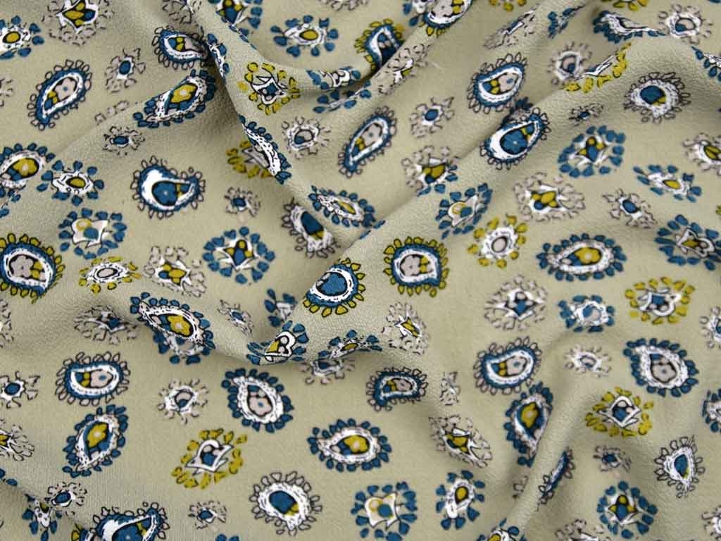 Ein wunderschöner Blusencrepe Stoff in hellem Taupe mit Paisley Muster in petrol und senfgelb. Die Oberfläche hat eine leichte Struktur. Der Stoff ist luftig leicht und hat einen weichen Fall.