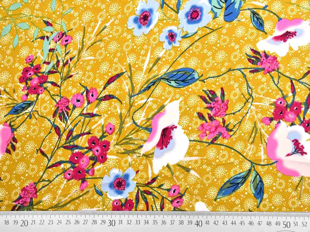 Ein weich fließender, ocker-farbener Blusenstoff mit pink-weißen nd rauchblauen Blumen, sowie Zweigen und Blättern in mint und rauchblau. Der Stoff ist leicht, sehr weich und glatt.