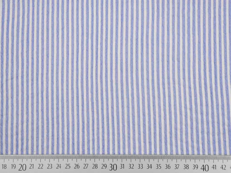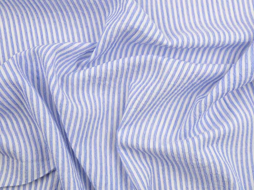 Ein leicht elastischer weicher Crinkle-Blusenstoff mit hellblauen und weißen Streifen. Die Streifen sind ca. 3mm breit.