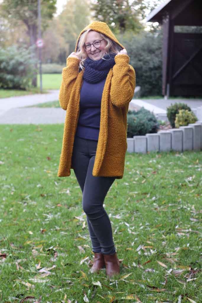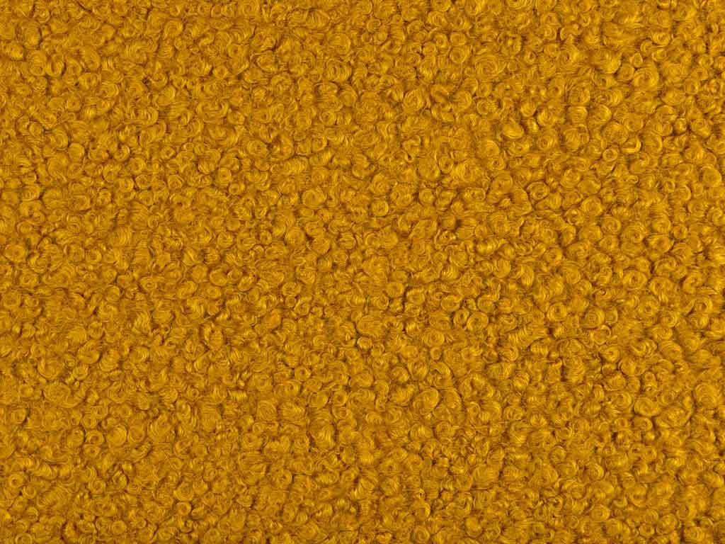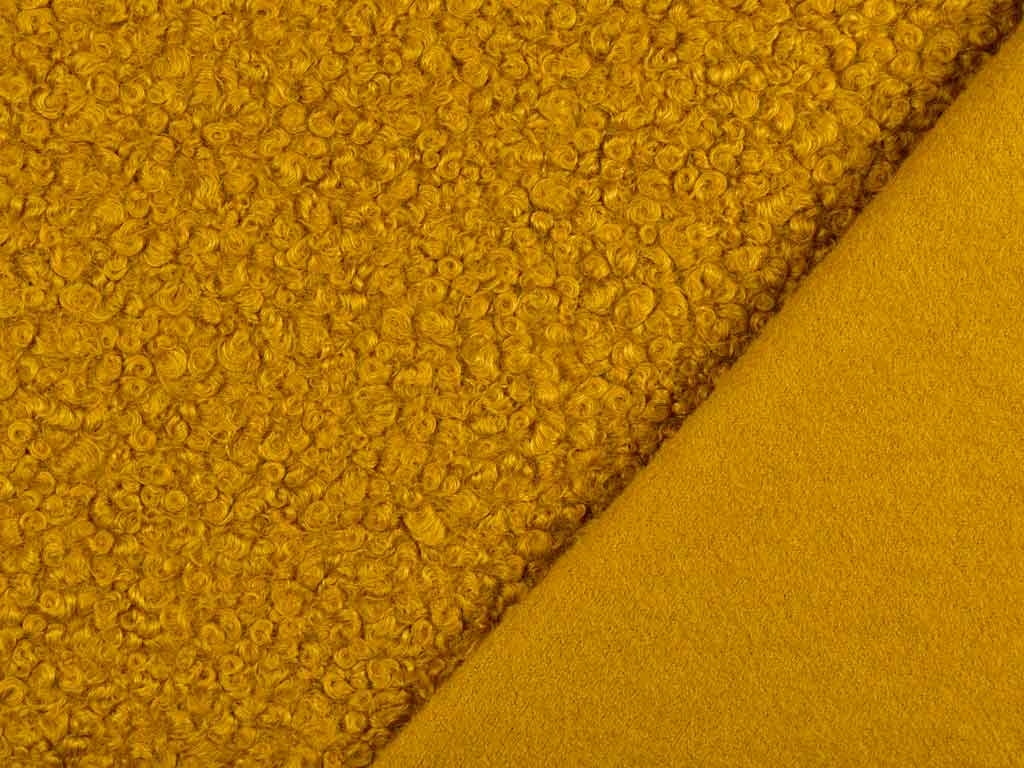 Ein warmer Boucle Stoff in Ocker. Der Stoff hat einen weichen, dickeren Griff und die "Löckchen" erinnern an Schafsfell.