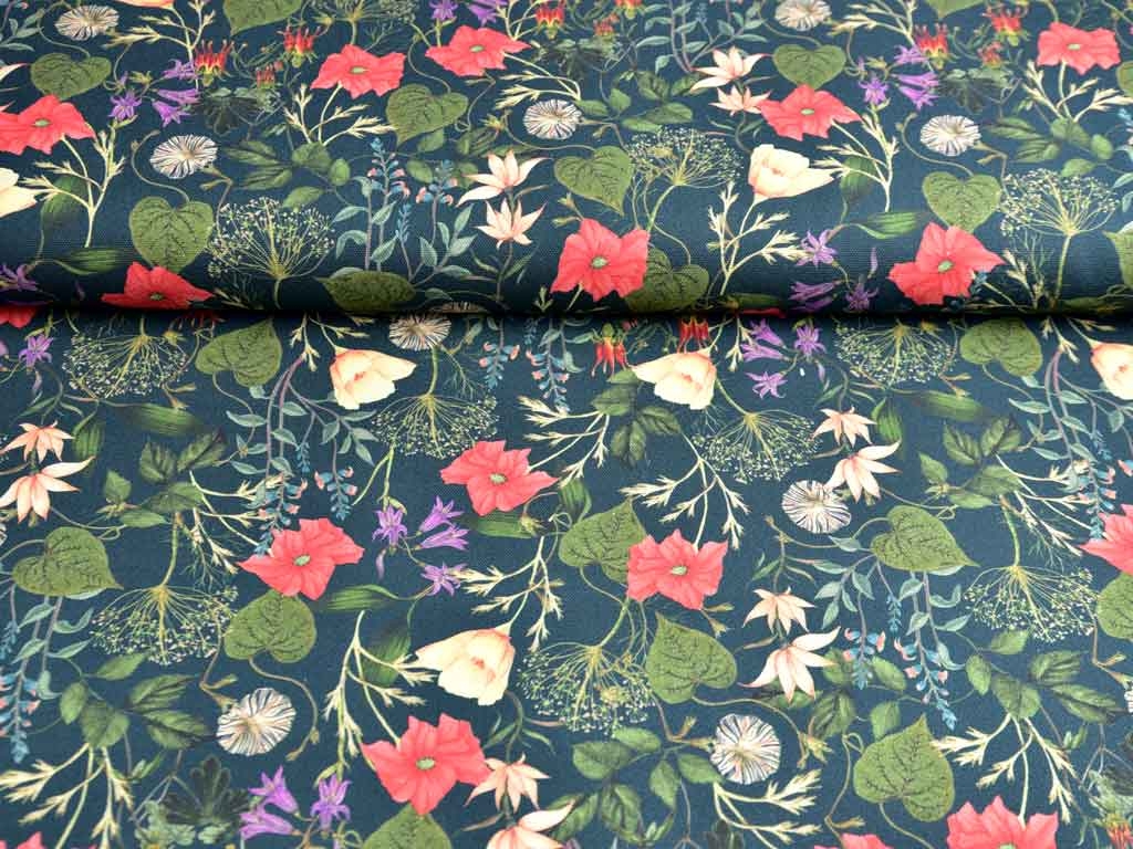 Ein wunderschöner, dunkelgrüner Canvas als Digitaldruck mit verschiedenen Blumen in coralle und aprikot sowie moosgrünen Blättern und Zweigen.
