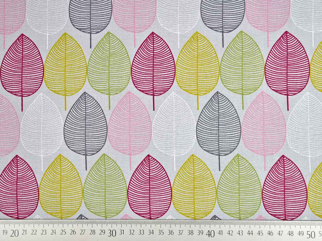 Ein hellgrauer Canvas Stoff mit weinroten, hellgrünen, grauen und rosa Blättern ganz im nordischen Stil.