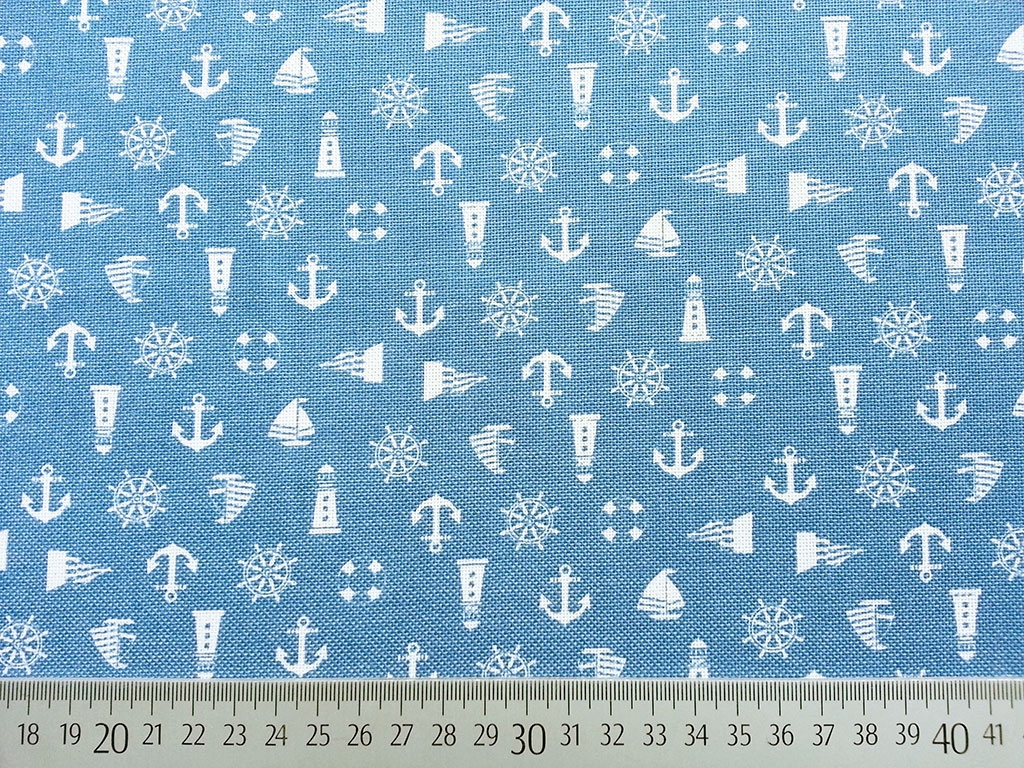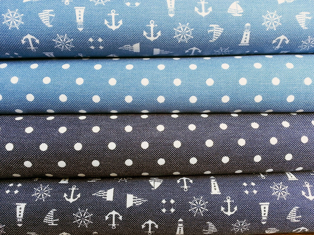 Ahoi! Ein wunderschöner Canvas in jeansblau mit weißen maritimen Motiven wie Ankern, Leuchttürmen, Steuerrädern und Segelbooten. Weicher Griff.