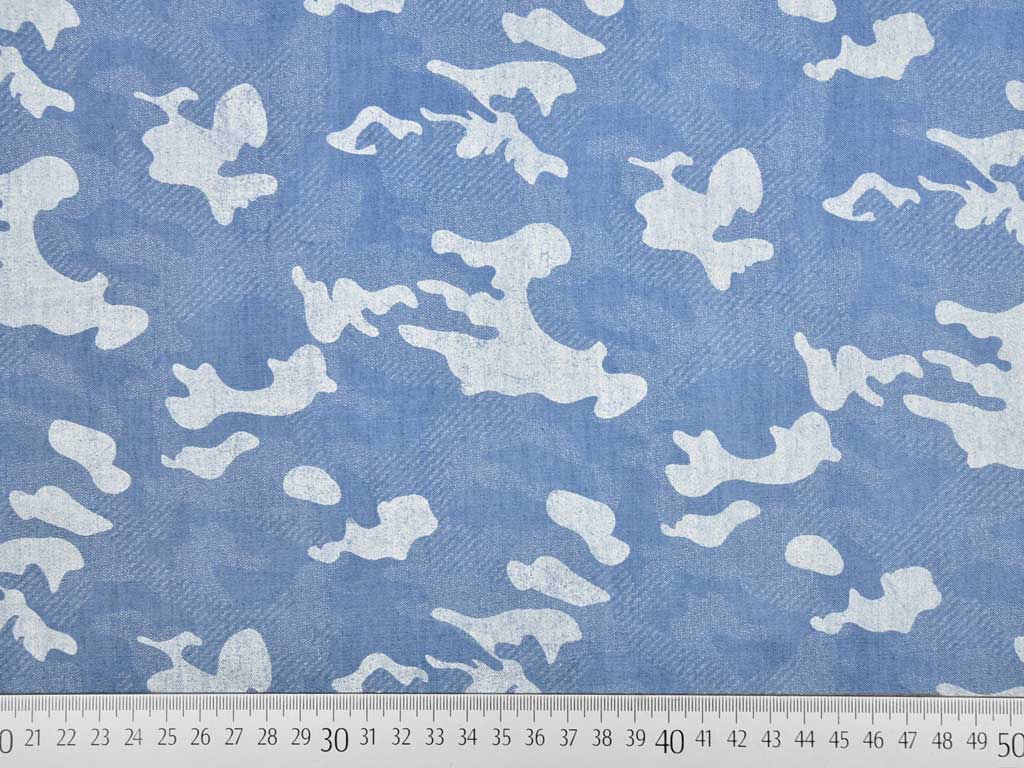 Ein weicher, gewaschener Lyocell Stoff in hellem Jeansblau mit trendigem Camouflage Muster. Der Stoff fällt gut und liegt angenehm auf der Haut.