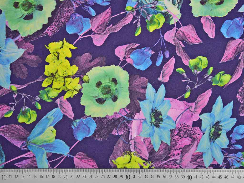 Ein luftig leichter Chiffon in dunkelblau mit Blüten, Zweigen und Ranken in hellgrün und türkis. In einfacher Lage ist Chiffon durchsichtig.