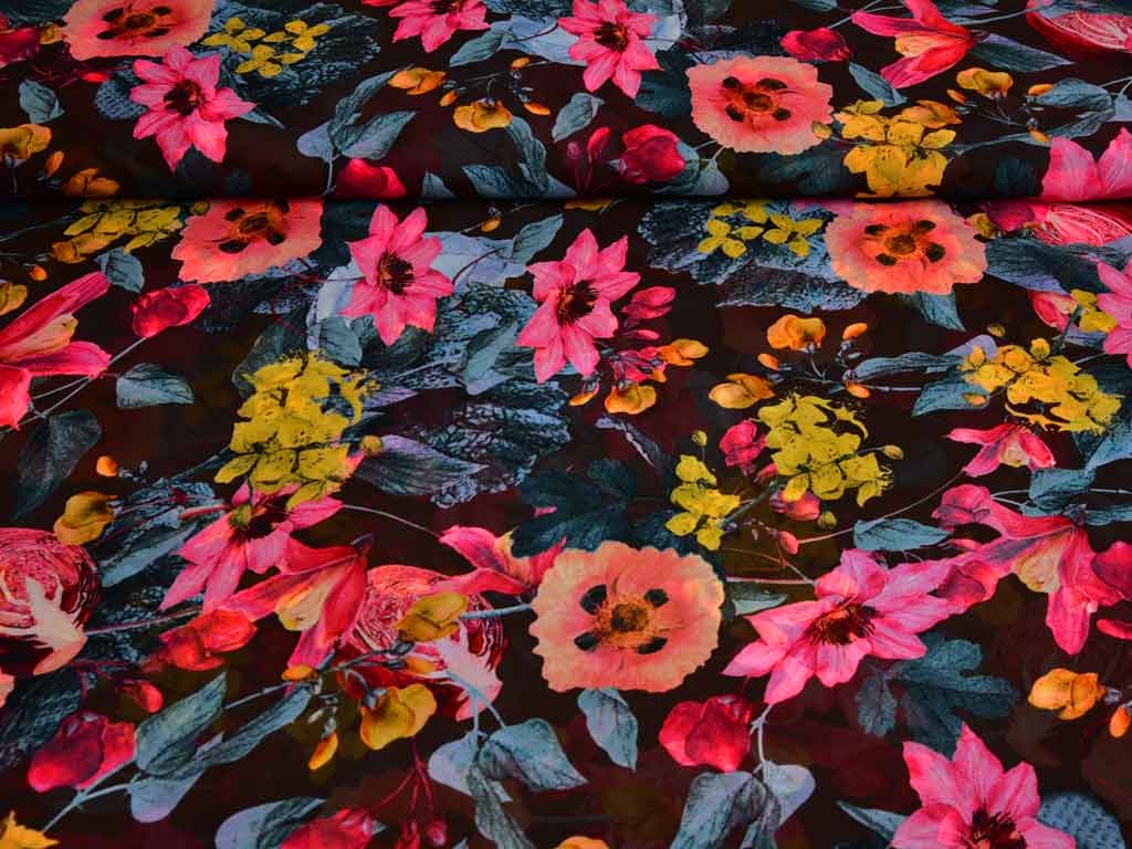 Ein luftig leichter Chiffon in dunkelbraun mit Blüten, Zweigen und Ranken in aprikot, pink und eisblau. In einfacher Lage ist Chiffon durchsichtig.