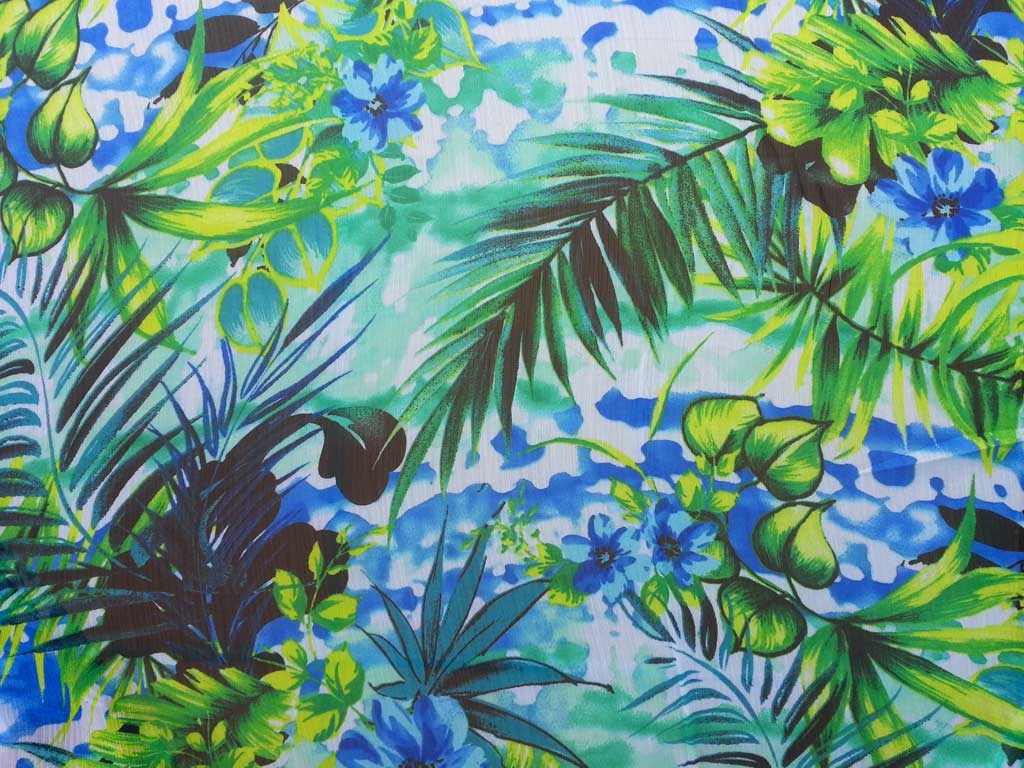 Ein luftig leichter und semi-transparenter Chiffon mit Pflanzen, opulenten Blüten, Früchten in den Farben hellgrün, grasgrün, gelbgrün und verschiedenen Blautönen.