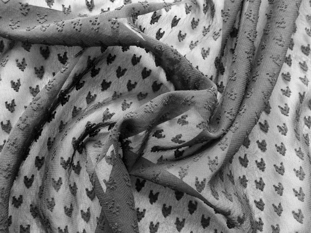 Ein weich fallender transparenter Chiffon Stoff in schwarz mit erhabenem Herzchenmuster.