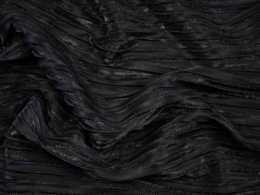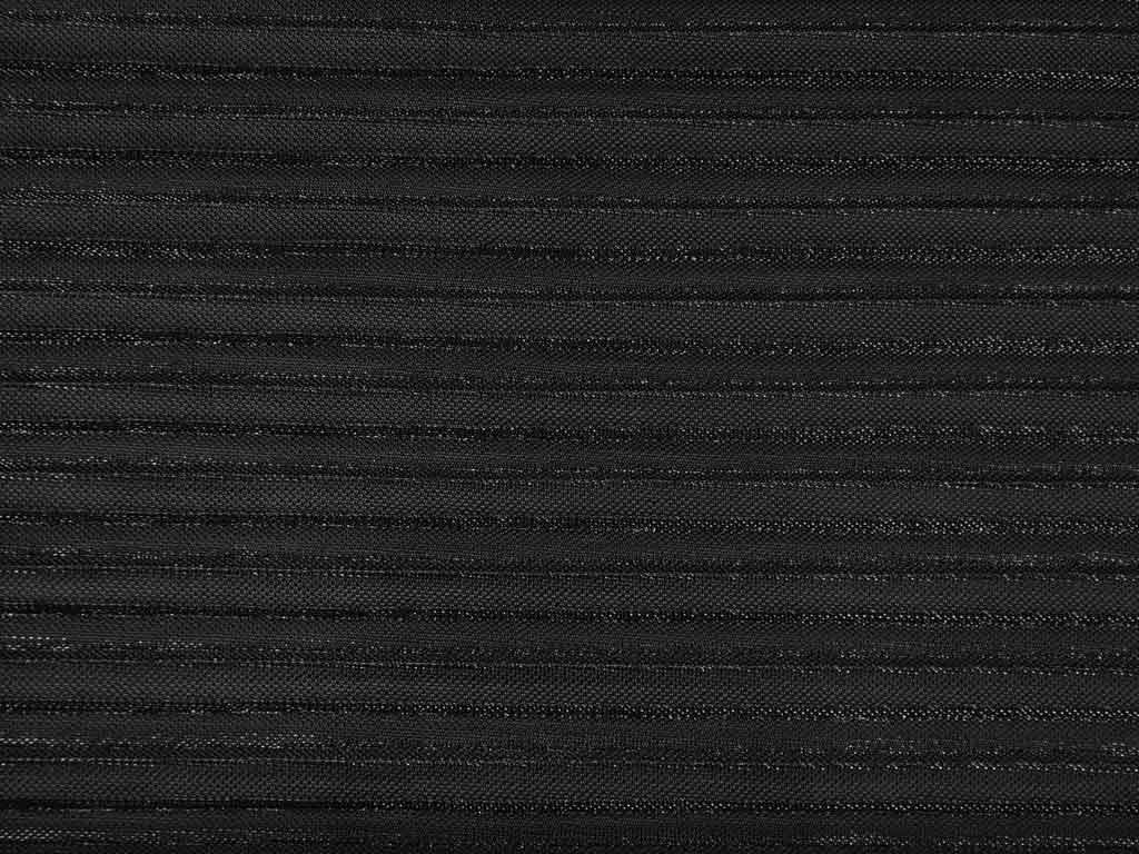 Ein eleganter Strukturstoff mit erhabenen Streifen. Die erhabenen Stellen sind schwarz, die tieferliegenden Streifen schwarz-glänzend. Der Stoff ist leicht elastisch. An den Glitzerstellen eine leicht kreppige Haptik. Die schwarze Rückseite fühlt sich glatt an.