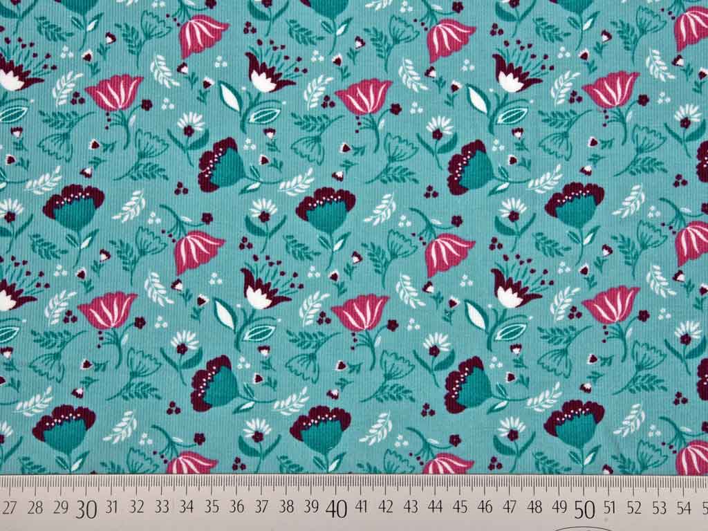 Ein weicher Feincord in Altmint mit Kelchblumen in dunkelmint, dunklem Altrosa, weiß und bordeaux.