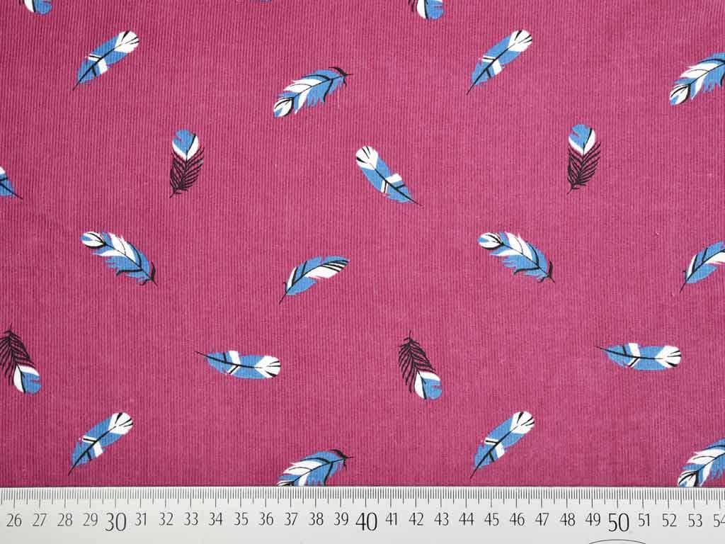 Ein weicher Feincord in dunklem Altrosa mit kleinen, gemusterten Federn in Hellblau, Weiß und Schwarz.