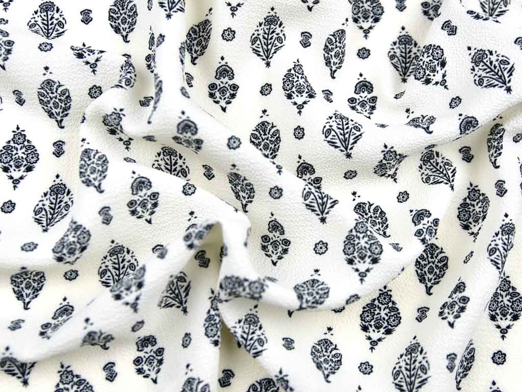 Ein luftig leichter Crepe Stoff in cremeweiß mit kleinen Blumensträußen in schwarz. Aufgrund des Elasthananteils dehnt sich der Stoff leicht und bietet guten Tragecomfort.