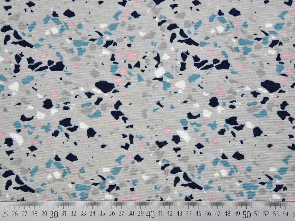 Ein etwas dickerer und festerer Stoff (Dekostoff) in grau mit Farbklecksen in dunkelblau, rosa. Einfach total schön!
