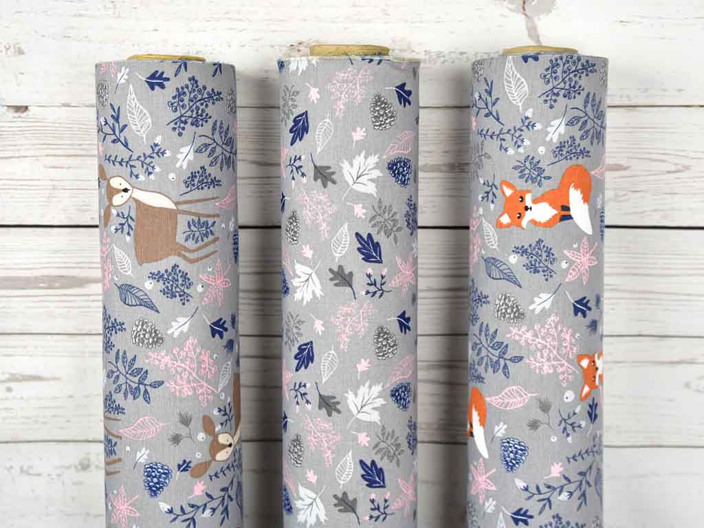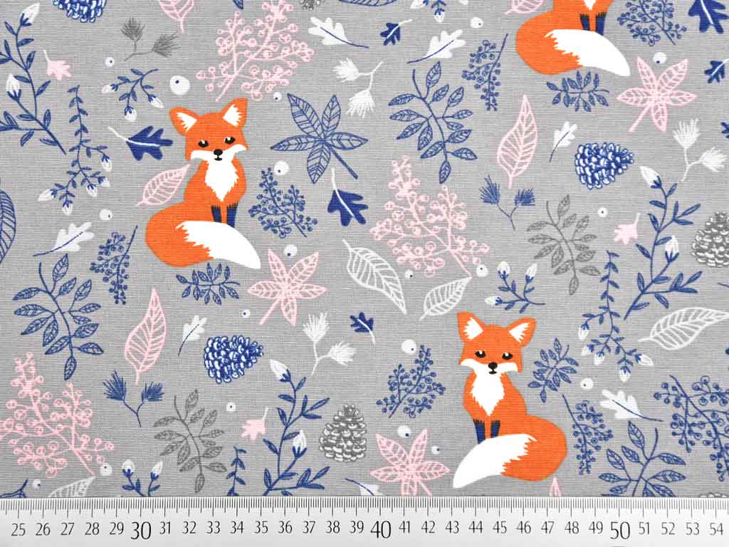 Ein etwas dickerer und festerer grauer Dekostoff mit rosa, dunkelgrauen und dunkelblauen Blättern und Zweigen sowie rostroten Füchsen.