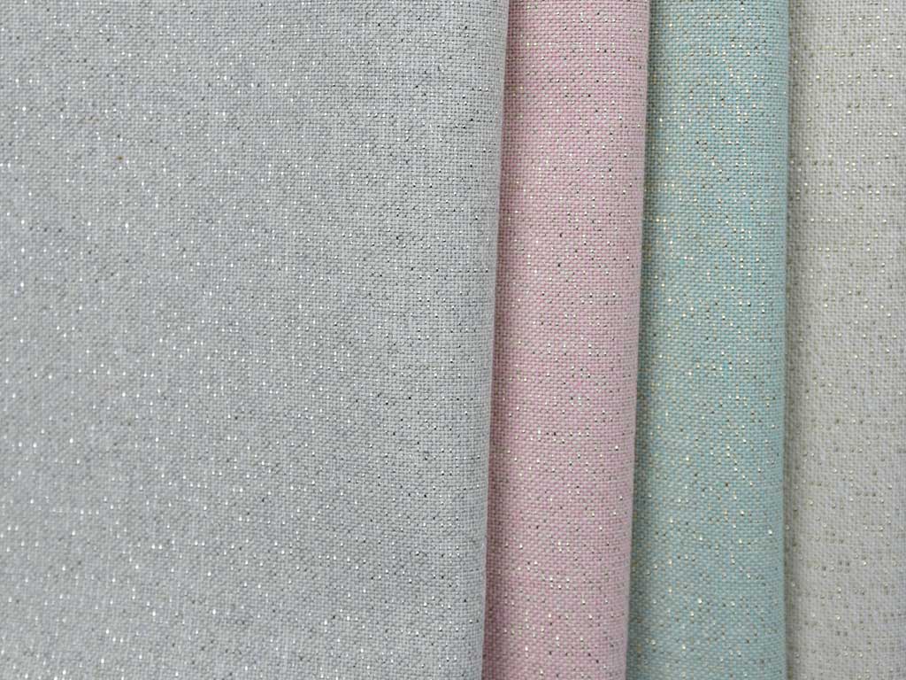 Ein etwas dickerer und festerer, cremeweißer Stoff, der mit goldenen Metallfäden durchwebt ist. Die Kettfäden sind ecru, die Schussfäden cremeweiß. Dadurch ist der Stoff cremeweiß meliert.