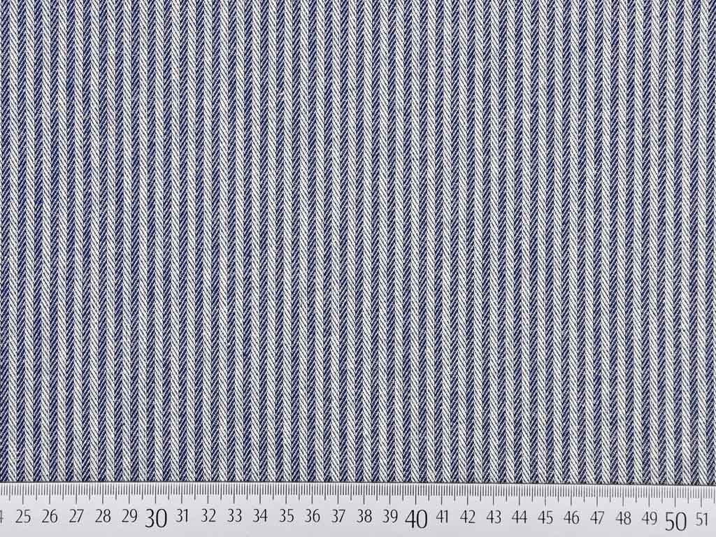 Ein wunderschöner etwas festerer Dekostoff als gewebter Jacquard Stoff mit Fischgrätmuster in kleinen Streifen in dunkelblau und ecrue.