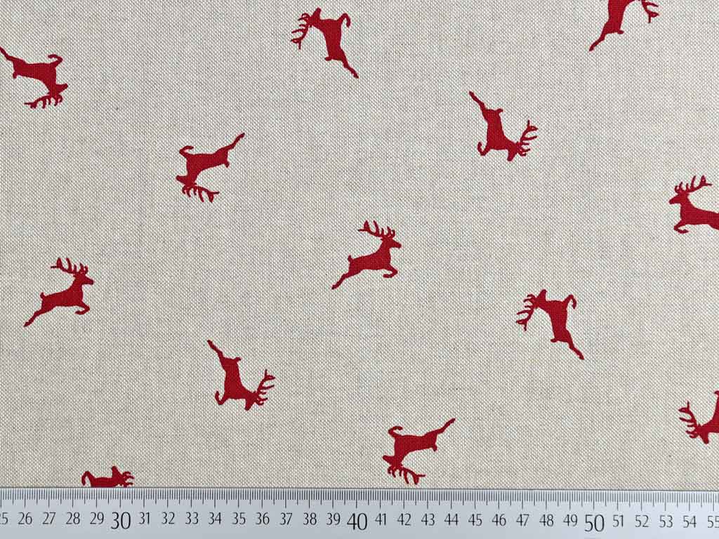 Ein etwas dickerer und festerer, naturfarbener Stoff (Leinenlook) bedruckt mit roten Hirschen, die ca. 4cm groß sind.