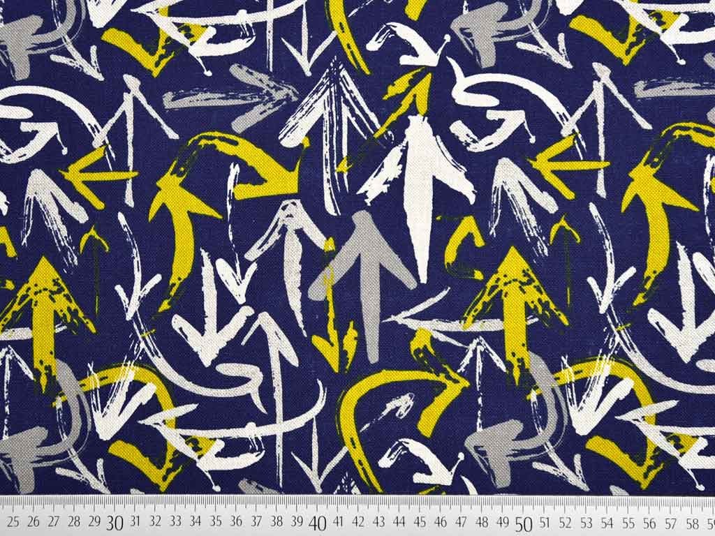 Ein etwas dickerer und festerer Stoff in dunkelblau (Leinenlook) bedruckt mit Pfeilen in senfgelb, taupe und natur im Graffiti Stil.