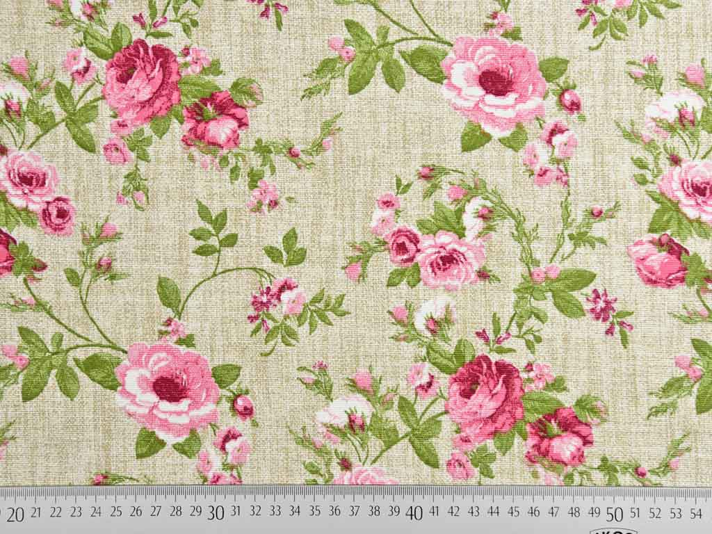 Ein naturfarbener Dekostoff in Leinenoptik mit rosafarbenen Rosen und hellgrünen Rosenstielen und -blättern.