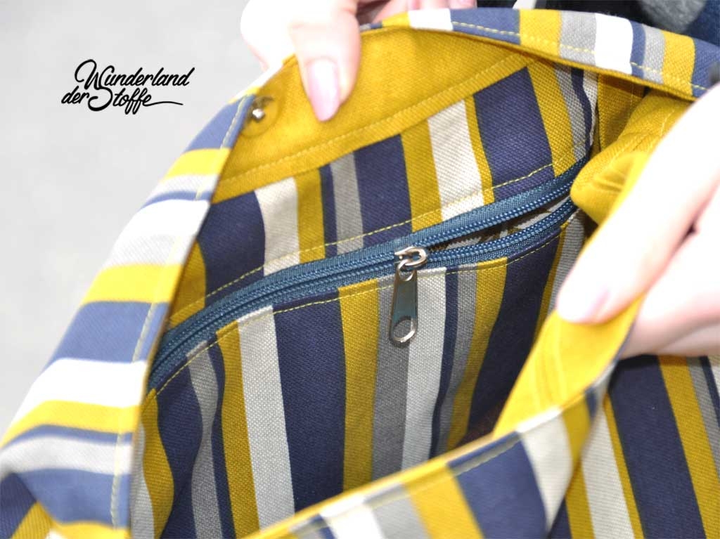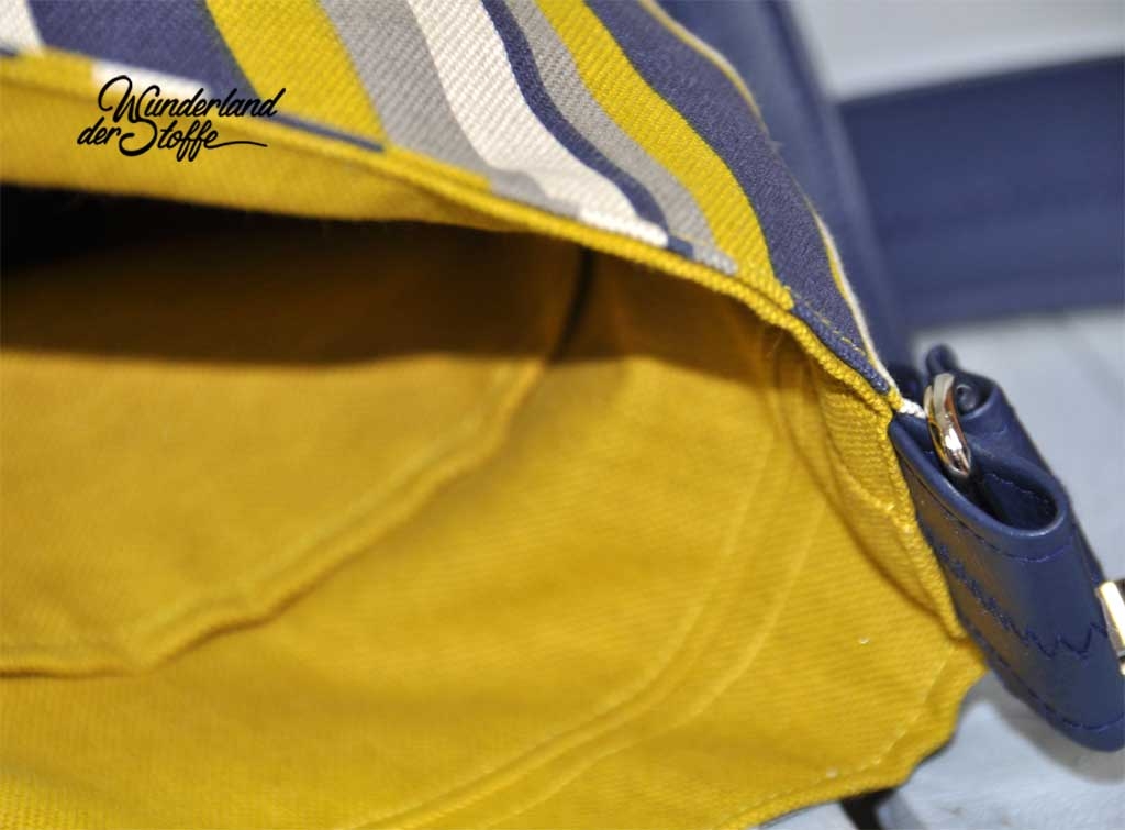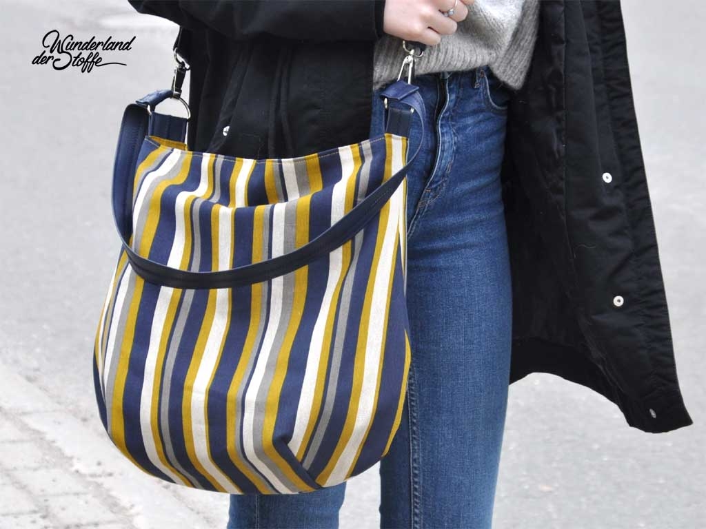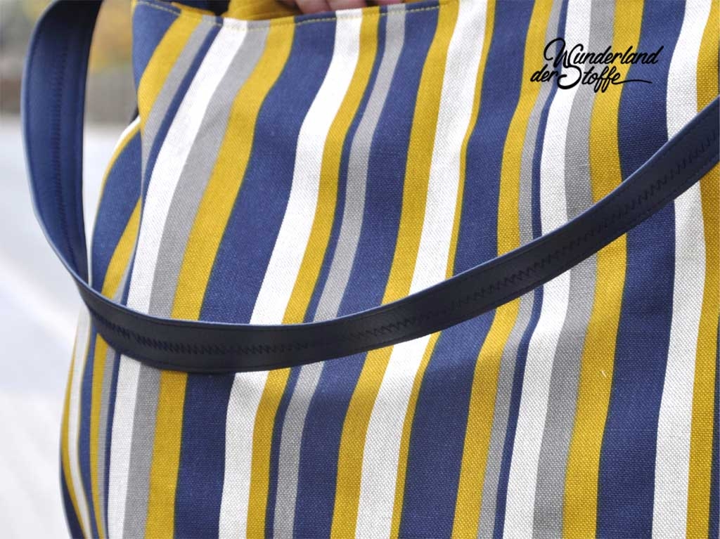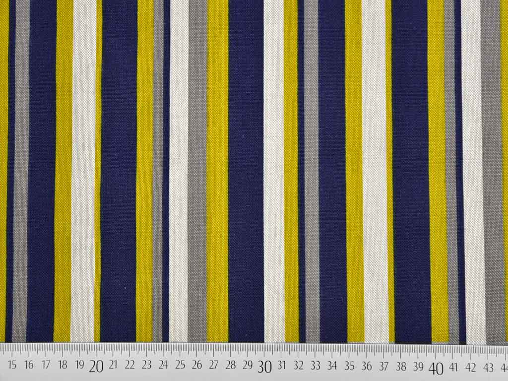 Ein etwas dickerer und festerer Stoff in natur (Leinenlook) bedruckt mit Streifen in senfgelb, dunkelblau und taupe.