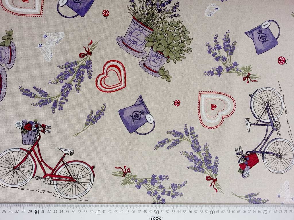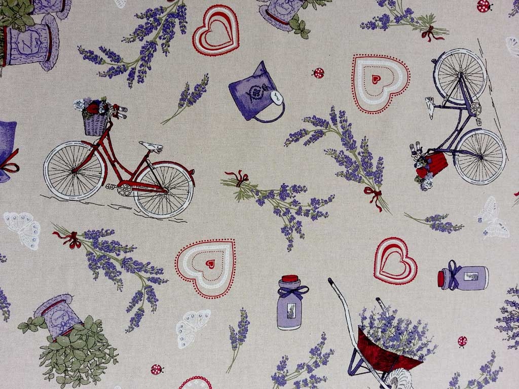 Ein wunderschöner Dekostoff in natur mit Lavendel, Fahrrädern, Herzen und Schmetterlingen in zartem Lila, weinrot, khaki und weiß. Durch den Polyester Anteil bekommt der Stoff eine gewisse Festigkeit und Robustheit.