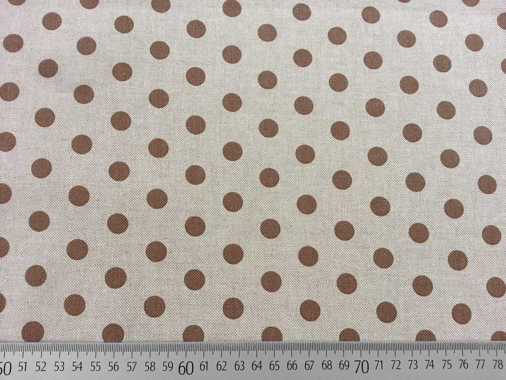 Ein toller Dekostoff in natur mit 1,3 cm großen braunen Punkten. Durch den Polyester Anteil bekommt der Stoff eine gewisse Festigkeit und Robustheit.