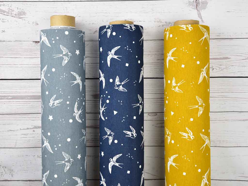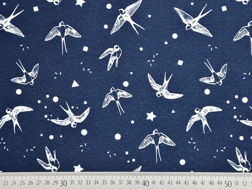 Ein etwas dickerer und festerer Stoff (Dekostoff) in dunkelblau mit weißen Schwalben, kleinen Dreiecken und Punkten. Einfach total schön!