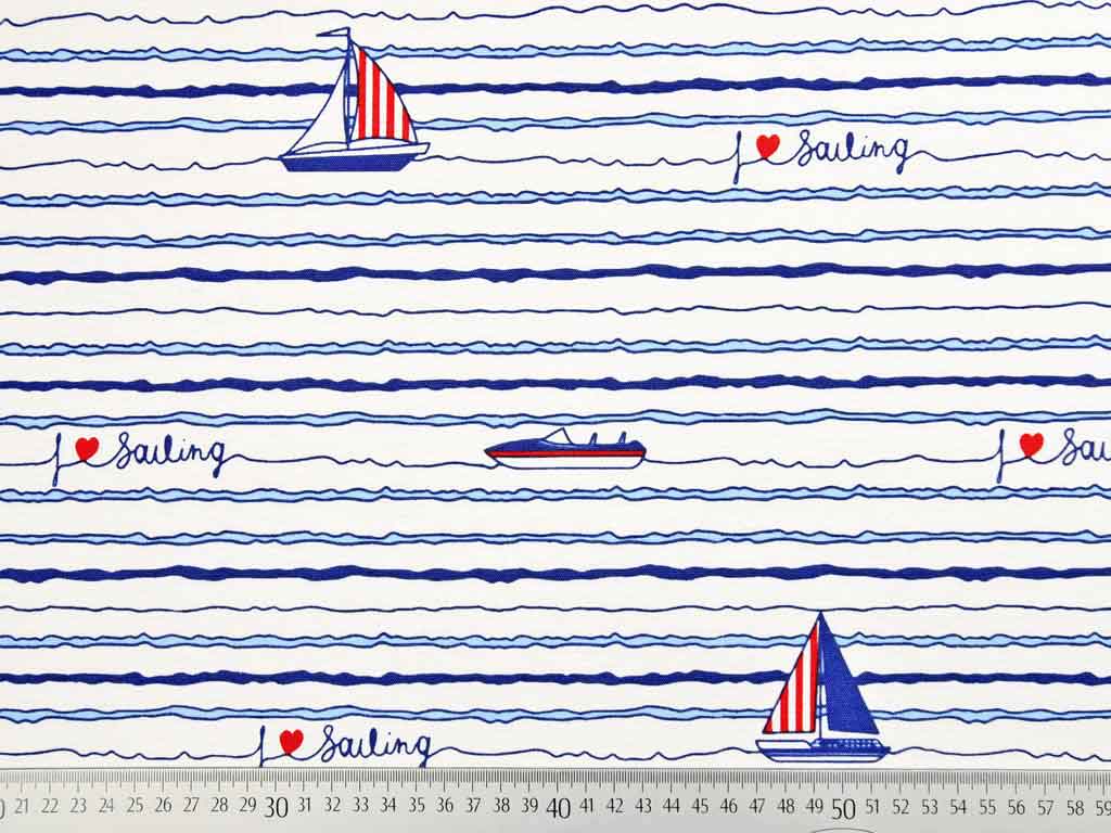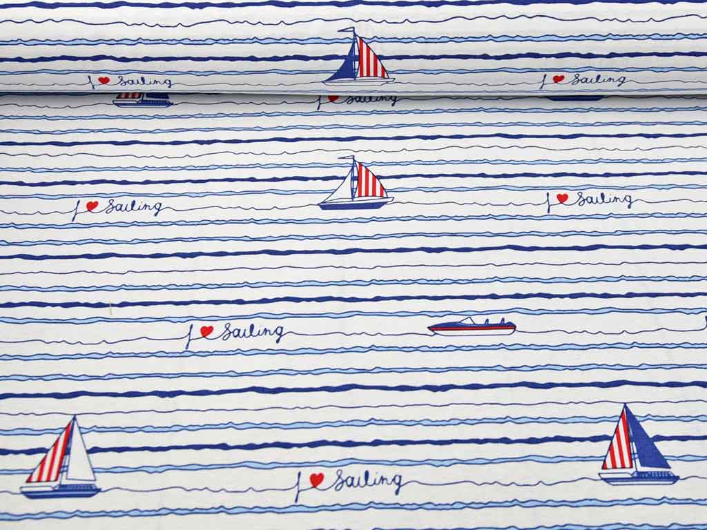 Ein schöner weißer Dekostoff mit Segelbooten und welligen Streifen in dunkelblau, blau und rot. Der Stoff hat einen etwas festeren Griff.