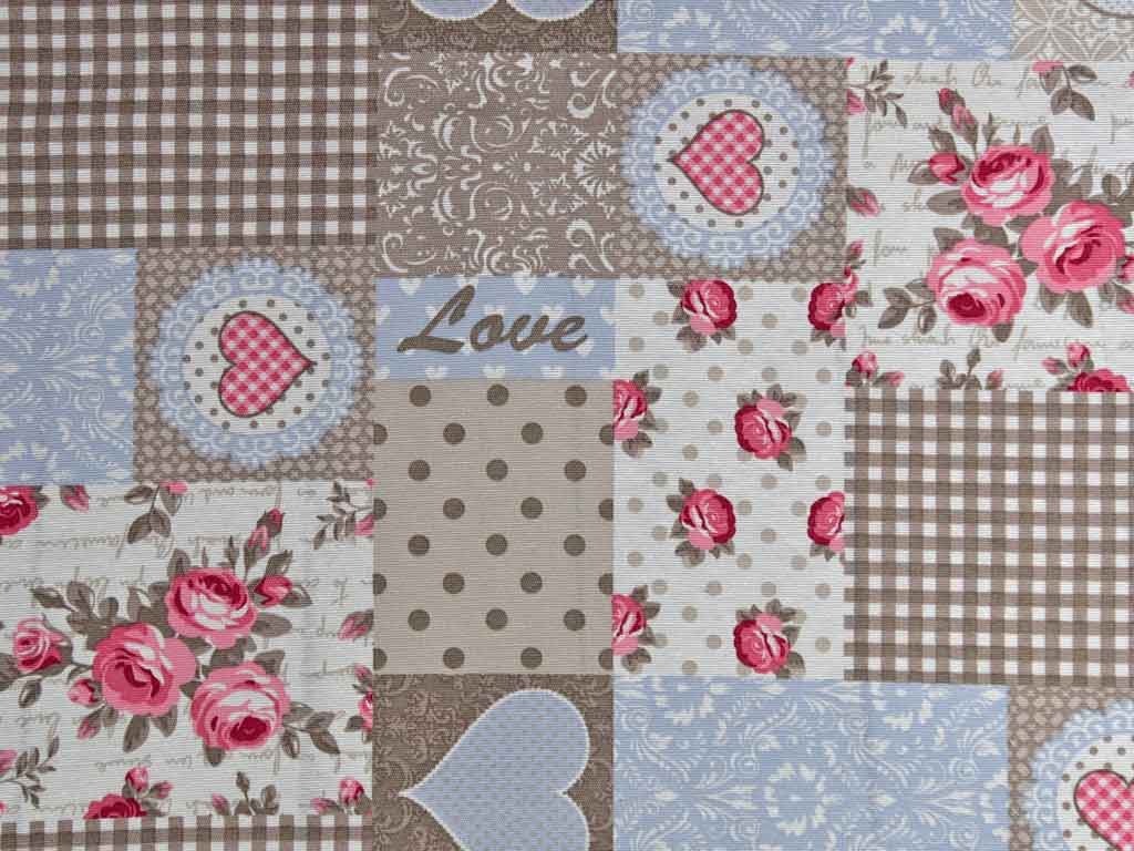 Ein cremeweißer Dekostoff im Patchwork Stil mit Punkten, Herzen, Blumenranken, Rosen, Vichykaro und Schriftzügen wie "Love". Der Druck im Shabby Chic Look ist in den Farben Sand, Rosa, Taupe, Hellblau und Cremeweiß gehalten.
