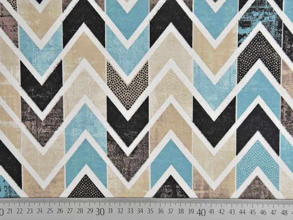 Ein Dekostoff mit cremeweißem Zickzackmuster und vertikalen Linien. Die daraus resultierenden Zwischenräume ergeben beige, rauchblaue und schwarze Pfeilspitzen, die teilweise mit Pünktchen oder Schraffierungen gemustert sind.