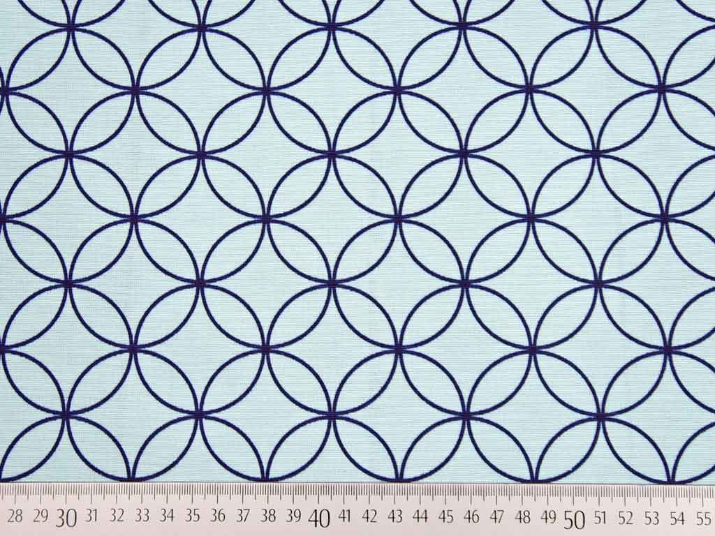 Ein etwas dickerer und festerer Dekostoff in hellem Mint mit dunkelblauen Kreisen und Kringeln.