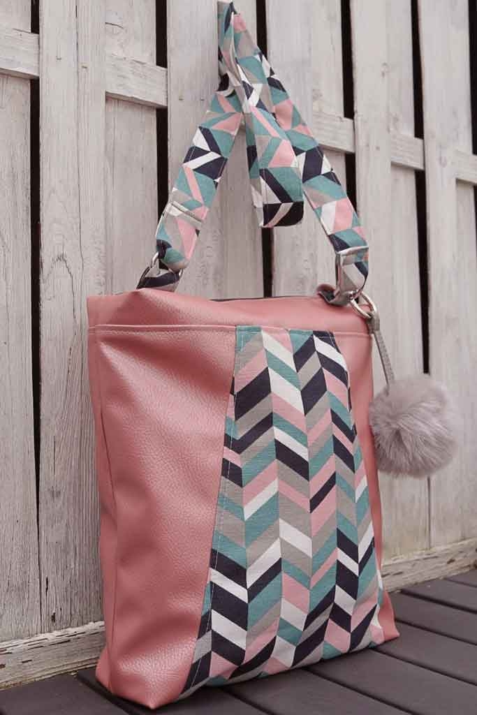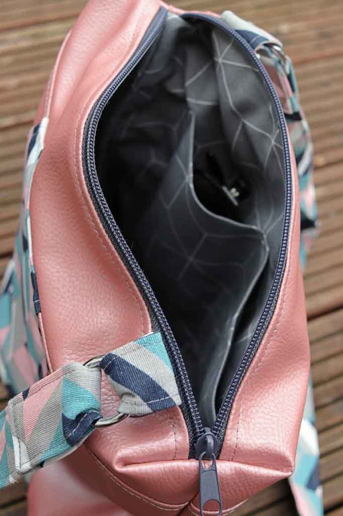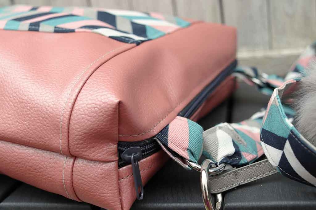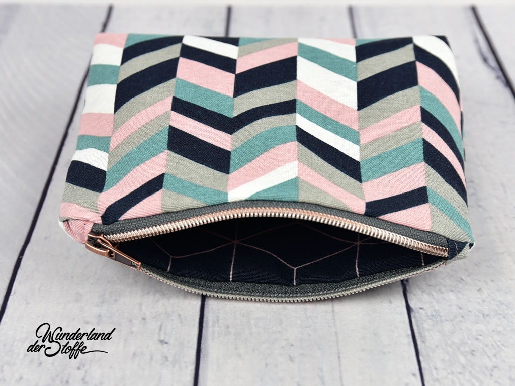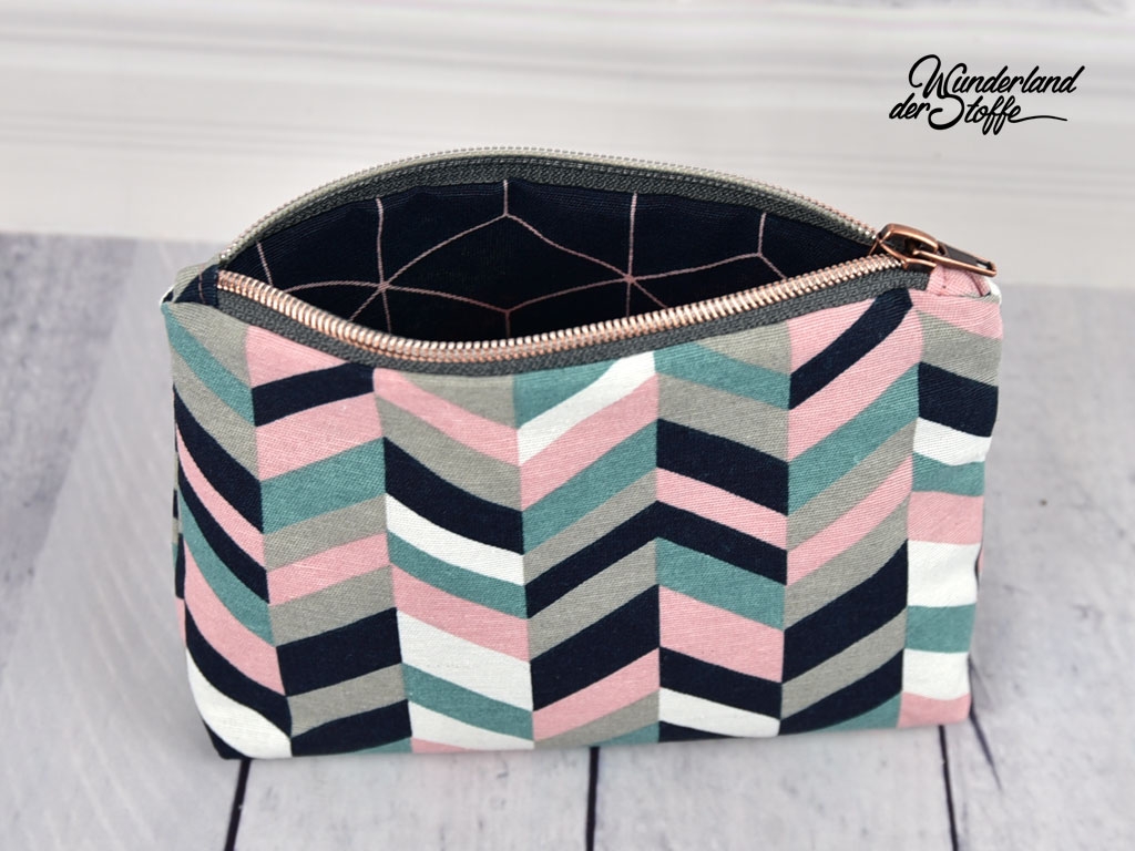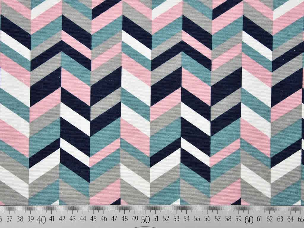 Ein etwas dickerer und festerer Stoff (Dekostoff) mit grafischem Muster in rosa, mint, grau und dunkelblau. Einfach total schön!