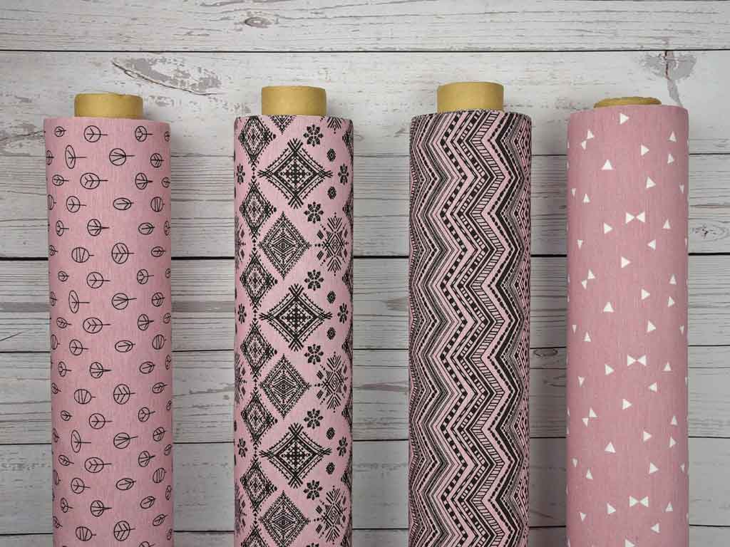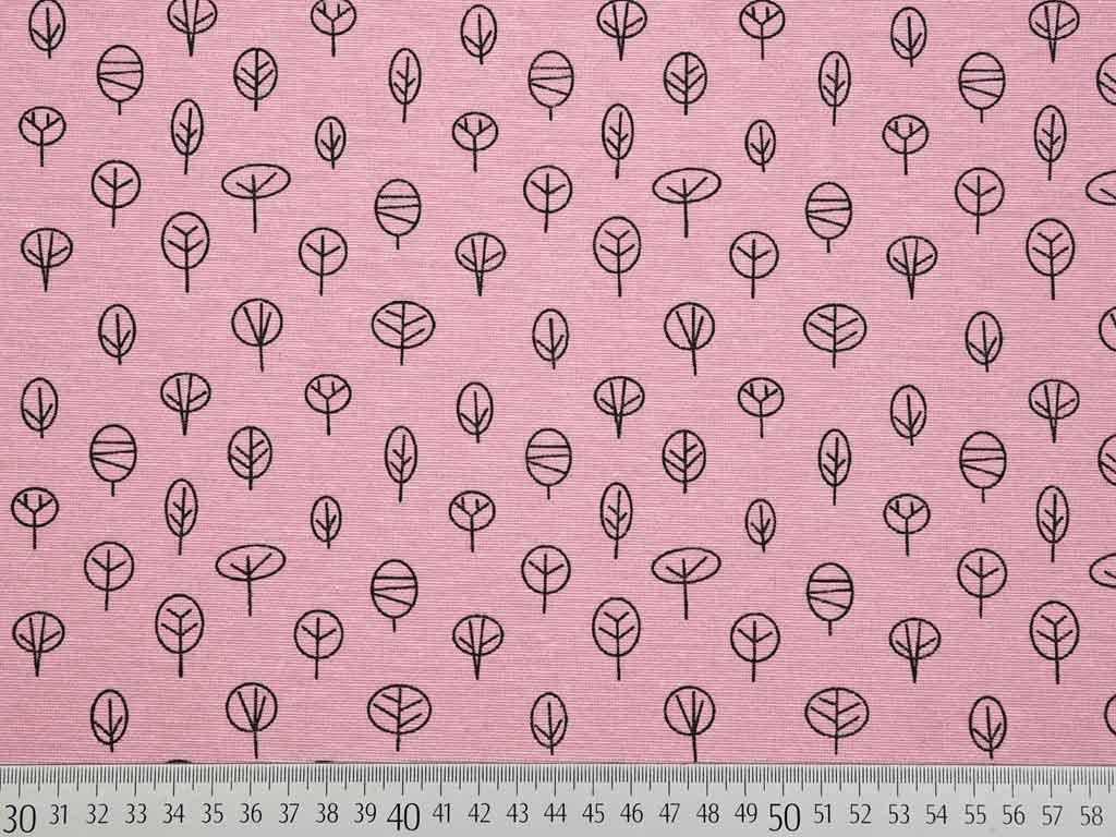 Ein etwas dickerer und festerer Stoff (Dekostoff) in altrosa mit kleinen, schwarzen Bäumen.