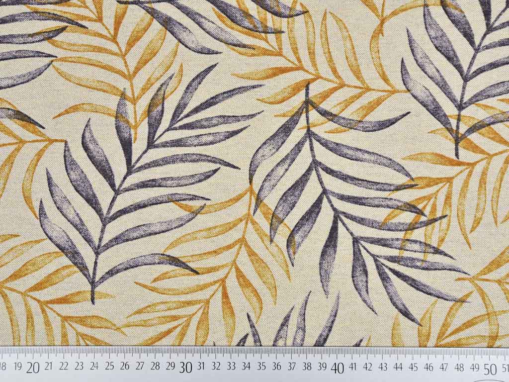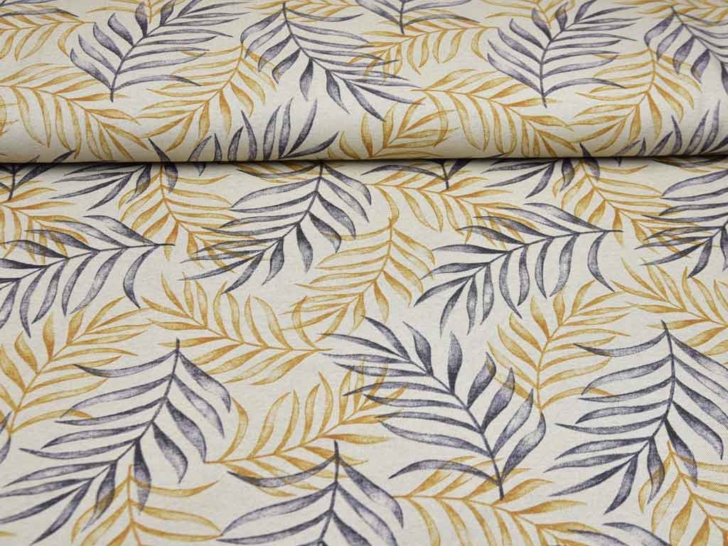 Ein schöner Dekostoff in natur (Leinenlook) bedruckt mit dunkelgrauen und ocker Palmenblättern.
