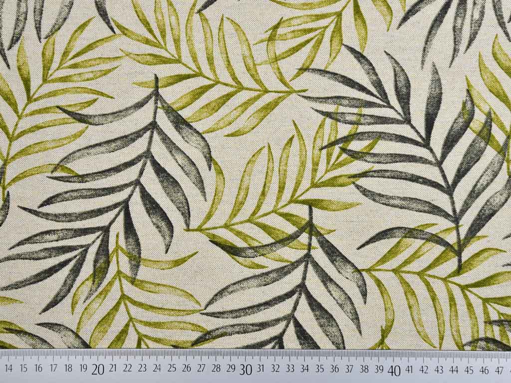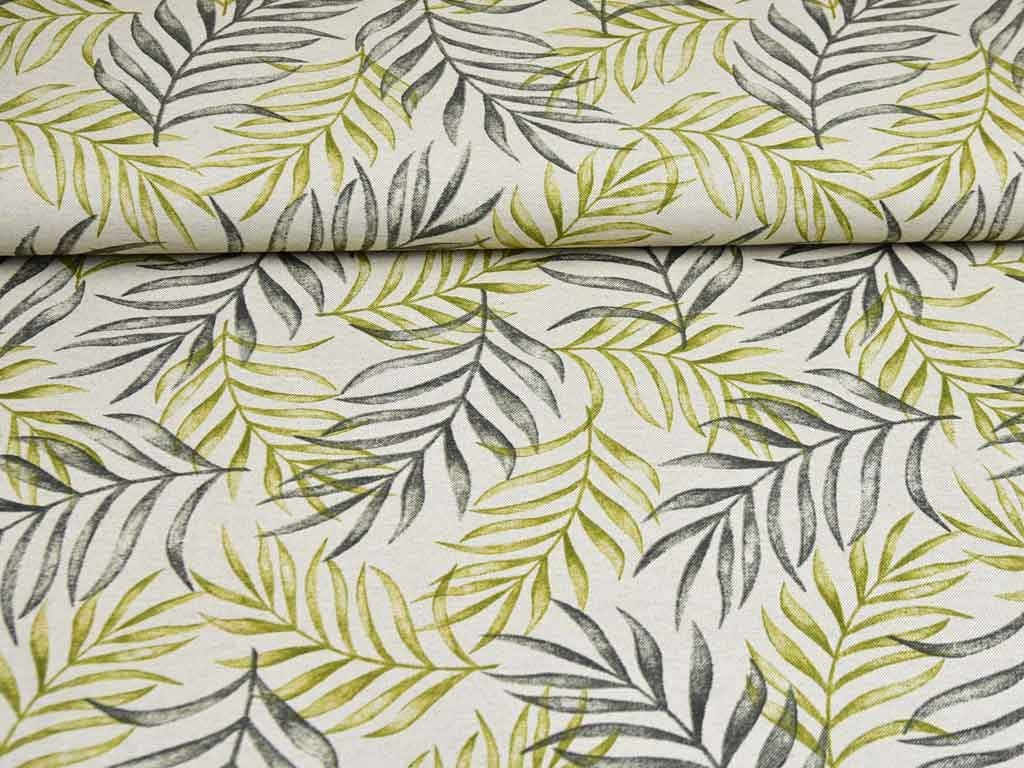 Ein schöner Dekostoff in natur (Leinenlook) bedruckt mit dunkelgrauen und khakigrünen Palmenblättern.
