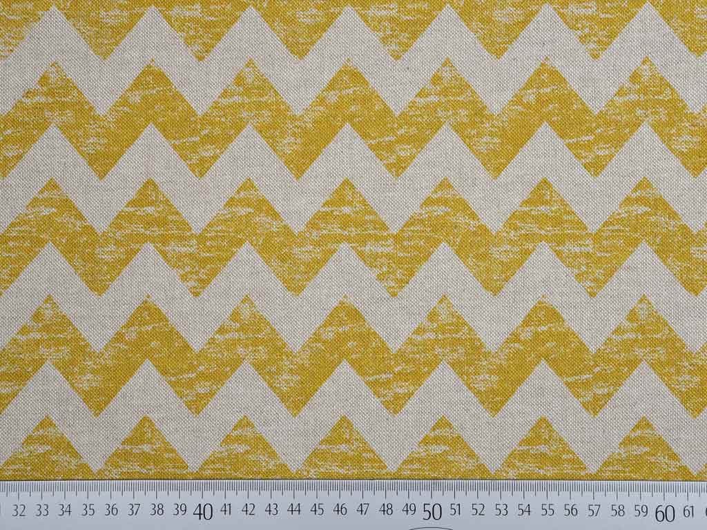 Ein etwas dickerer und festerer Stoff in natur (Leinenlook) bedruckt mit gemustertem ocker Zickzackmuster.