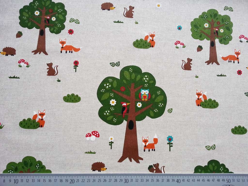 Ein toller Dekostoff in Leinen-Optik (Farbe natur) mit Füchsen, Bäumen, Igeln und Pilzen.
