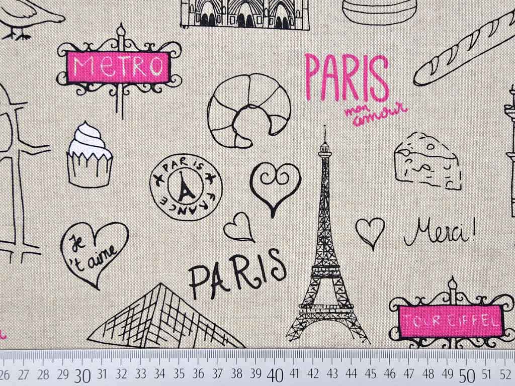Ein schöner Dekostoff in Leinen-Optik (Farbe natur) mit schwarzen und pinken Motiven aus Paris wie z.B. der Eifelturm, die Aufschrift "Paris", das Metro Zeichen.