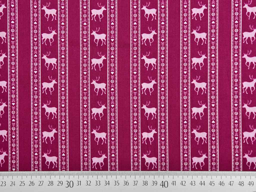 Aus der Edelweiß Kollektion ein weicher, bordeauxfarbener Baumwollstoff (Popelin) mit Bordüren im Trachtenlook z.B. mit kleinen rosa Herzen und Ornamenten sowie hellrosa Hirschen.