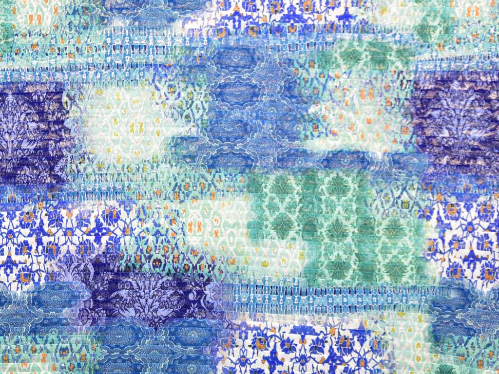 Ein edler Plisseestoff mit goldfarbigen Glitzer in verschiedenen Blau - und Grüntönen.