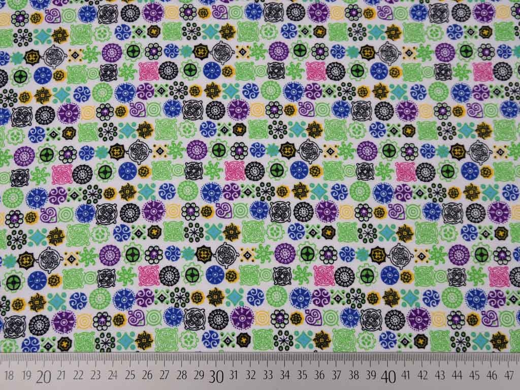 Ein butterweicher Baumwollflanell in hellgrün mit bunten Mandalas in hellgrün, lila, hellpink und gelb. Der Flanell ist auf beiden Seiten angeraut und somit kuschelig weich.