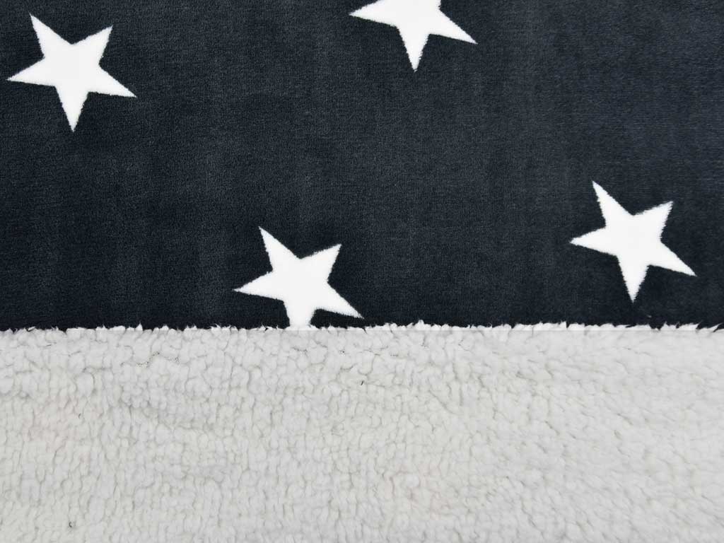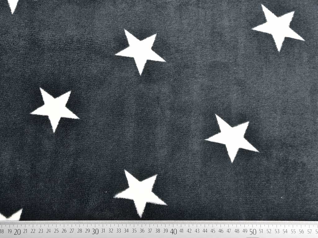 Ein super weicher Flanell Jacquard in dunkelgrau mit weißen Sternen. Die Rückseite ist ein kuscheliger Teddyfleece in weiß.
