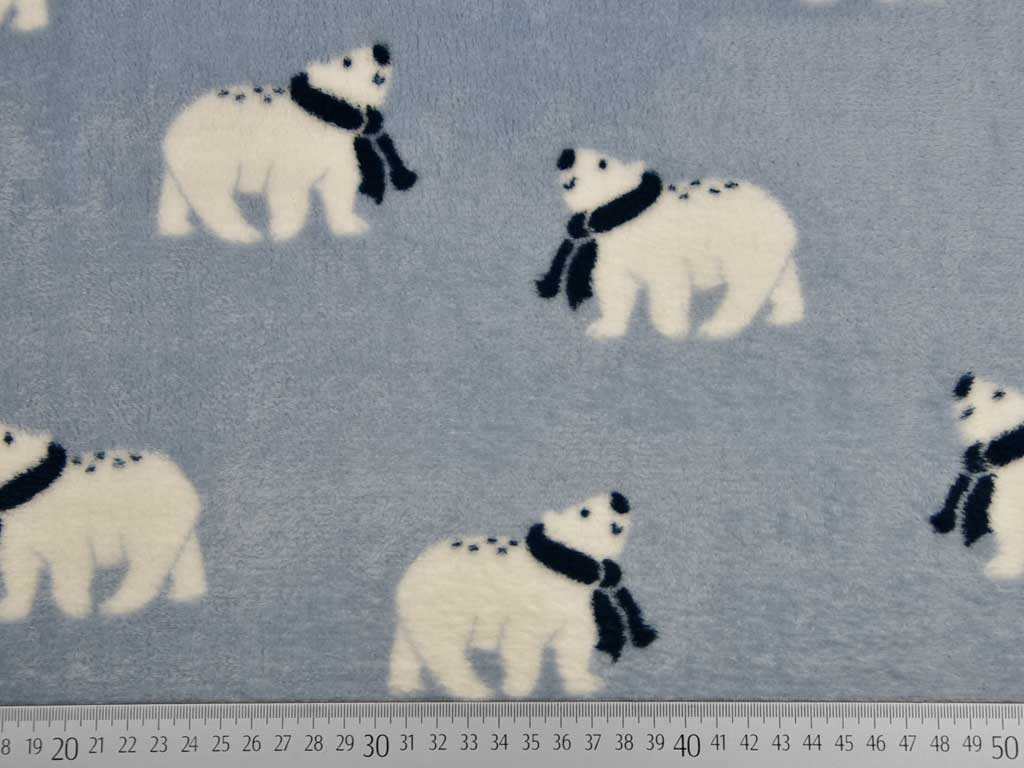Ein super weicher Doubleface Wellnessfleece in hellblau mit Eisbären. Die Rückseite ist genauso kuschelig und hat unterschiedlich breite Streifen in dunkelblau, weiß und hellbeige.